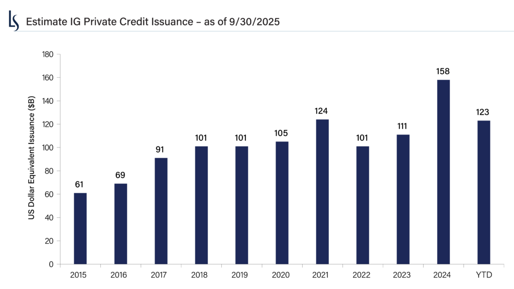 Last year, the market saw a notable surge in issuance in the investment grade private credit market. By November 2025, total reported issuance was expected to reach about $175 billion, already $25 billion higher than 2024ās peak, and when all the data is finalized, 2025 is likely to finish above $200 billion.2 Thatās a significant jump. Itās important to remember, though, that these numbers only reflect reported dealsāsome transactions arenāt disclosed, so we believe that the actual volume is even higher.