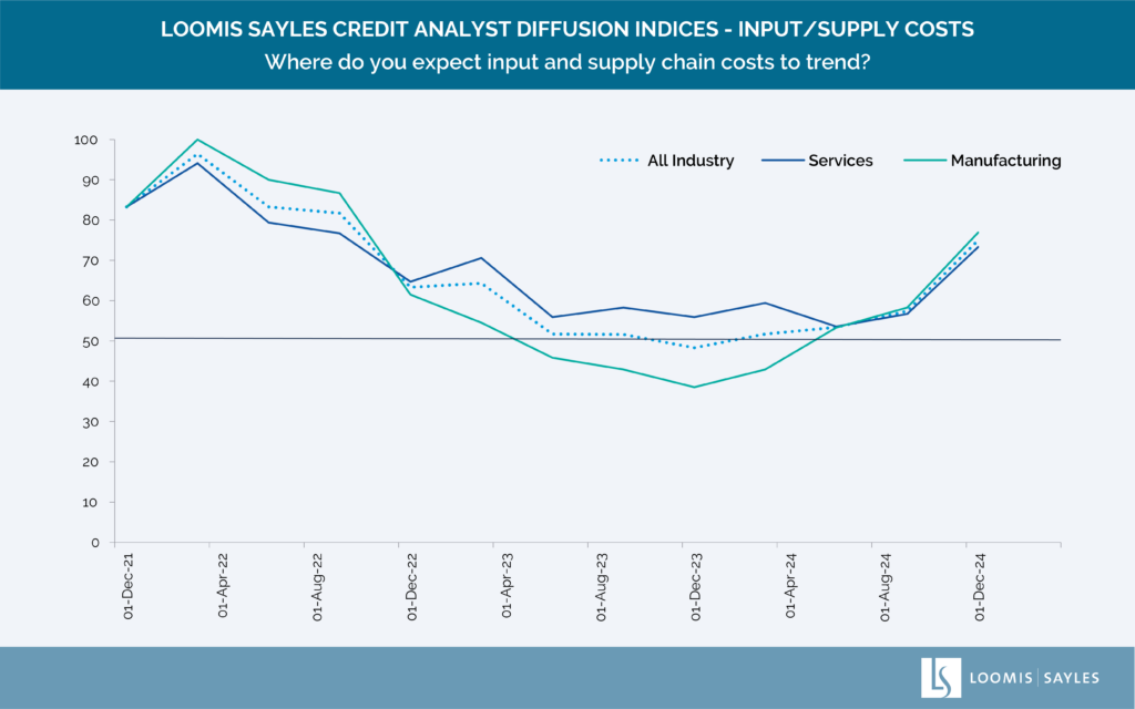One of the most striking findings from the latest reading is the broad rise in input and supply chain costs across industries. Credit analysts overwhelmingly expect increasing cost pressures across sectors. Expectations for tariff rollouts and labor shortages are key drivers of this trend, compounded by ongoing supply chain disruptions in some industries.