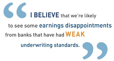 Warren Buffett said “It’s only when the tide goes out that you learn who’s been swimming naked.” I donāt totally understand this. People donāt get washed up on the beach at low tide, only jellyfish. But I believe that weāre likely to see some earnings disappointments from banks that have had weak underwriting standards.