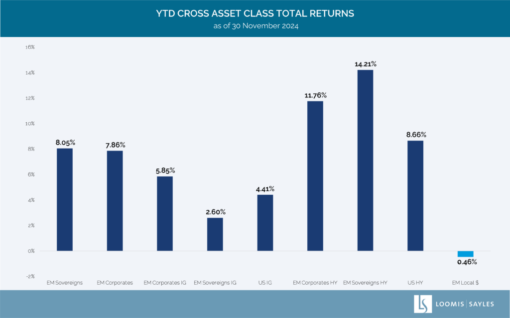 From January through November 2024, US-dollar-denominated EM sovereign bonds and corporate bonds have provided positive returns while EM local-currency government bonds have struggled against a strong US dollar. Notably, US-dollar-denominated EM corporate bonds have outperformed their US investment grade and US high yield counterparts. Currency volatility often makes the news, but the challenges affecting the local-currency index have had little to no impact on the EM hard-currency asset class performance, which has continued to benefit from countries experiencing economic growth, strong company fundamentals and global interest rate easing.