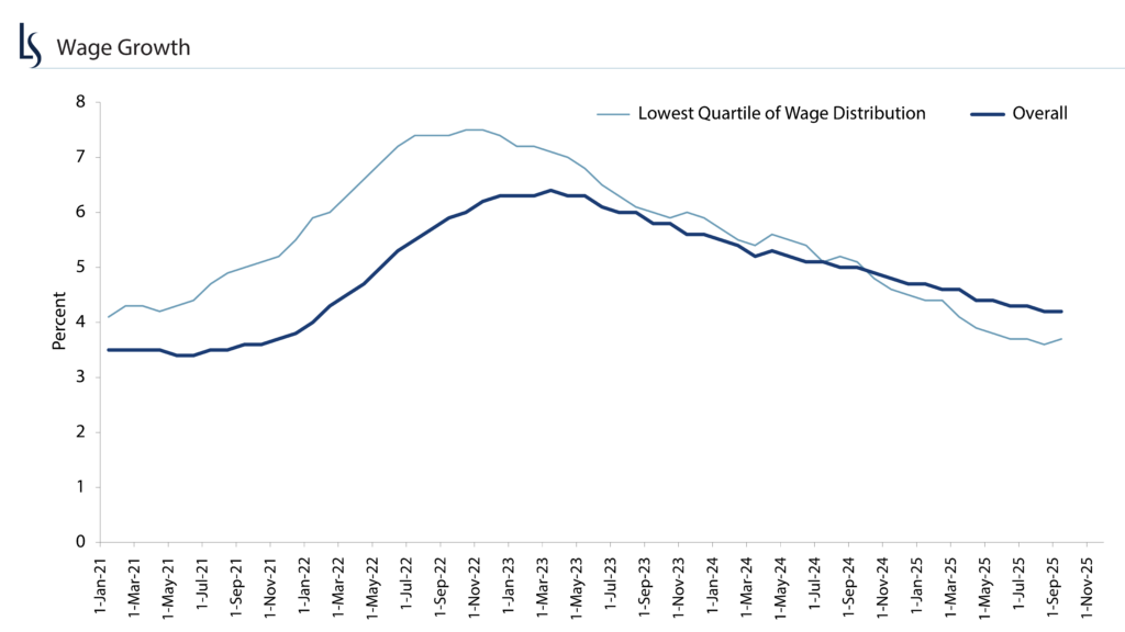 Labor market confidence, as measured by quit rates (the percentage of workers voluntarily leaving jobs), remains below pre-COVID-19 levels. Historically, elevated quit rates signal optimism and wage mobility in the workforce; todayās lower levels suggest moderate confidence heading into 2026. Wage growth has also moderated, particularly among lower-income households and job switchers. While wage growth remains positive overall, the deceleration suggests discretionary spending among lower-income households will likely remain constrained in 2026.