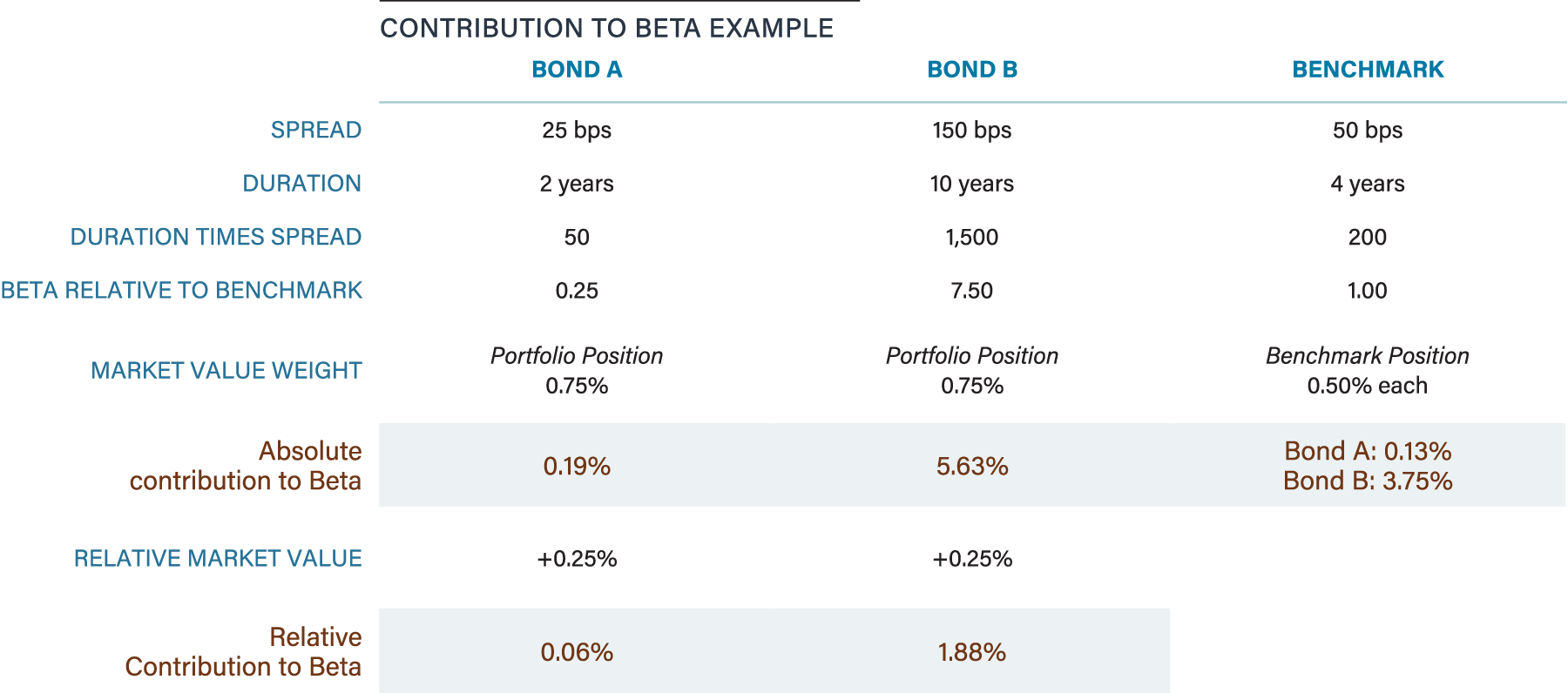We believe beta is a more accurate way to measure our relative risk than simply relying on market value. Relative risk in beta terms may be different than market value weights because beta also incorporates duration, spread and historical volatility. In simpler terms, a beta greater than zero implies an overweight, while a beta of less than zero implies an underweight. Higher values also indicate greater relative risk exposure. For example, the two bonds in the table below are from the same industry, have identical portfolio market value weights and are represented in the benchmark. However, contribution to beta, both absolute and relative, differs materially due to distinct duration and spread characteristics.