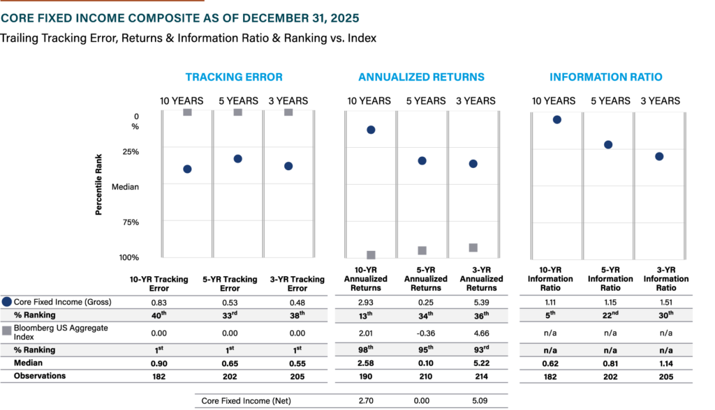 Core strategies need to do more than just manage tracking error to a benchmark, typically the Bloomberg US Aggregate Index. Trying to replicate a benchmark can come with some undesired tradeoffs. As of December 31, 2025, the Bloomberg US Aggregate Index posted bottom-quartile returns in the core fixed income manager universe for the 1-, 3-, 5- and 10-year periods.i These returns highlight the shortcomings of an autopilot approach to core fixed income investing. Importantly, many active core strategies can and have generated attractive relative returns for investors over a market cycle (as shown on page 8).