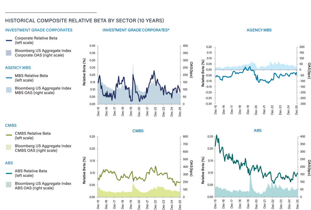 Source: Loomis Sayles and Bloomberg, from December 31, 2015-December 31, 2025. Beta characteristics are shown as supplemental information for the most actively