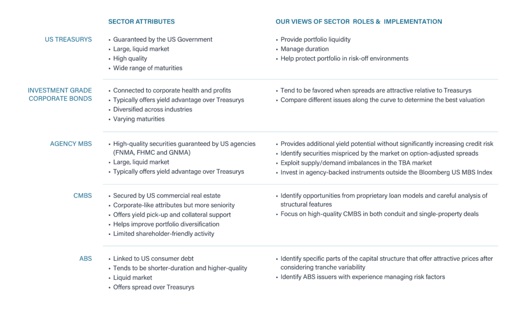 The investment universe for core strategies is vast and comprised of US Treasurys, agencies, agency mortgages, investment grade corporate bonds, CMBS and ABS. The economic and fundamental drivers of these investment grade sectors are markedly different. Therefore, making impactful, well-timed use of these sectors can be a challenge, even for the savviest investor. As illustrated in the table below, each sector offers a distinct contribution to a diversified portfolio. Within the Loomis Sayles Core Fixed Income strategy, we dynamically allocate among these sectors based on top-down views and populate them with our best bottom-up security ideas.
