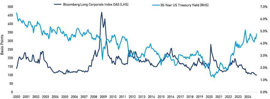 Following modest spread widening in early August 2024, long corporate spreads (as represented by the Bloomberg Long Corporate Index) narrowed significantly through the end of the year. Spreads broke the 100-basis-point floor on 6 November, entering their first double-digit level since July 1998āa period of more than 25 years. Despite a generally positive macroeconomic backdrop, further spread narrowing from current levels seems unlikely to drive outsized returns.
