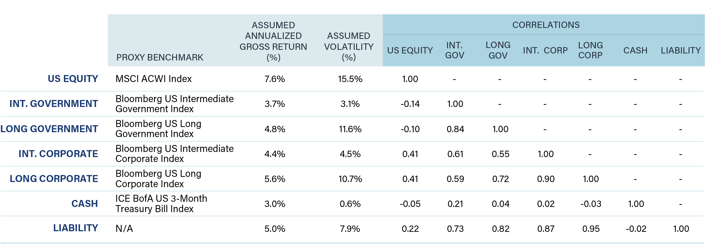 Capital Market Assumptions Methodology Assumed returns for all Return Seeking asset classes use annualized historical index data for the period of December 31, 2000, through December 31, 2025. Assumed returns for all Liability Hedging asset classes uses the current yield to worst of the benchmark as of December 31, 2025. Assumed volatility and correlations are compiled using monthly historical return data for the period December 31, 2000, through December 31, 2025. Liabilities are modeled as an asset class using a duration and credit spread matched blend of fixed income asset classes.