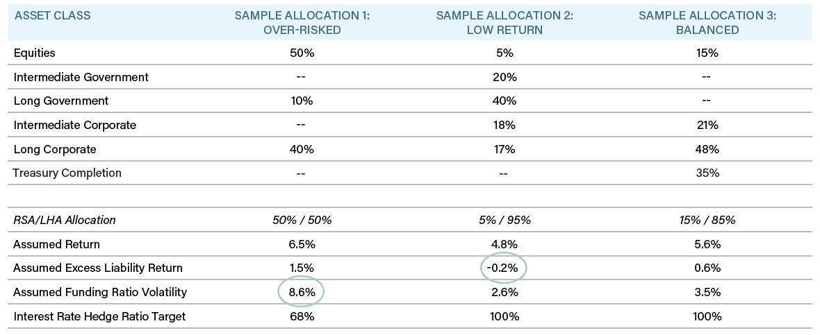 - Sample Allocation 1 remains underhedged with a reasonably high funding ratio volatility. Even a one standard