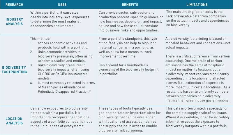 While company-reported biodiversity data remains limited, there has been a significant increase in tools to measure biodiversity footprints and exposures. We believe the best path at present is combining three distinct research avenues to try and create a complete picture.