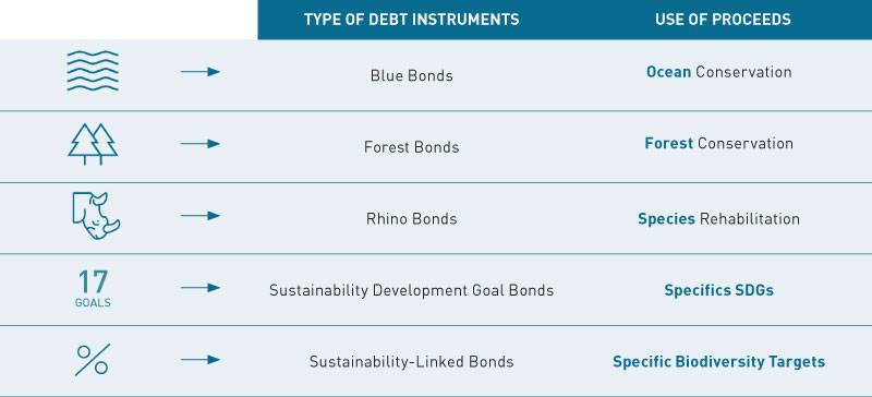 The other concept worth exploring from a bond investorās perspective is the primary issuance market. Primary issuance can be used by issuers to fund everything from general corporate purposes to acquisitions and specific projects. Investors are provided with information on how the proceeds of the bond issuance will be used, sometimes with more detail and other times with less, and this can provide an opportunity for investors to actively participate in or avoid certain industries, issuers or projects that would have a material negative impact on biodiversity. The environmental, social and governance (ESG) bond market has grown tremendously during the past few years.12 While the majority of structures are focused on climate change, there are new and growing avenues for biodiversity-focused investing (see table below). ESG-labeled bonds are a potential solution to conservation funding and a means for investors to encourage biodiversity conservation.