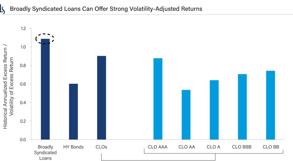 - Historically strong volatility-adjusted returns. For investors seeking below-investment-grade floating-rate exposure, BSLs have historically delivered strong volatility-adjusted returns. As illustrated in the chart below, BSLs have historically outperformed when compared to CLO tranches and high yield corporate bonds on a volatility-adjusted basis.