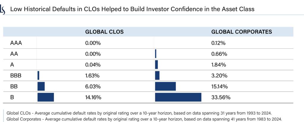 - Historically attractive returns and lower defaults than similarly rated corporate bonds. Despite lingering skepticism around structured products after the global financial crisis, CLOs have demonstrated resilience across multiple market cycles. As seen in the charts below, CLOs have historically delivered attractive returns with minimal default losses compared to similarly rated corporate bonds. We believe that this performance has helped rebuild investor confidence and drive demand.