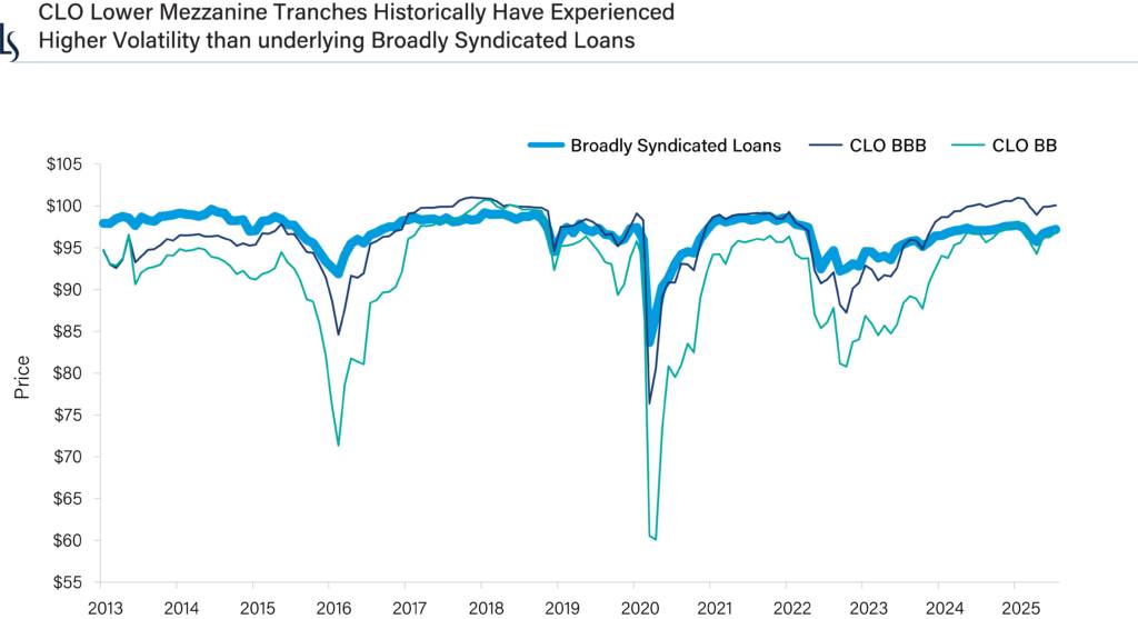 - Potential for greater volatility. The enhanced return potential of CLOs comes with greater mark-to-market volatility, particularly in mezzanine tranches, which are lower in the capital structure. Mezzanine tranches are more sensitive to changing market expectations around defaults and the pricing of structural leverage. As investors move down the capital stack, price volatility increases due to the fear of interest payment deferral and principal losses. Historically, CLO lower mezzanine tranches have traded with significantly more volatility than the underlying bank loans, but that price volatility has not resulted in higher defaults.