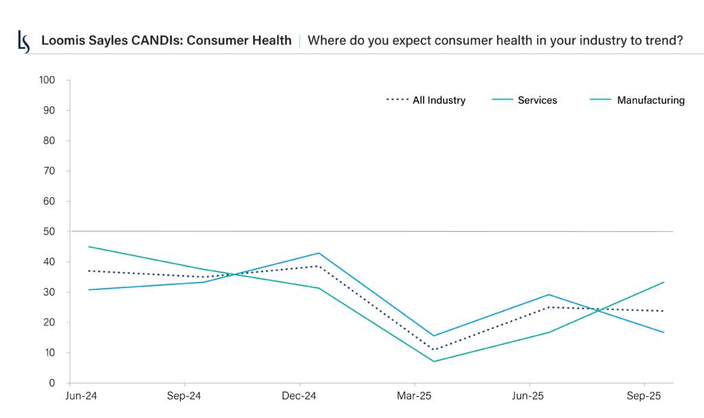 Chart source: Loomis Sayles Credit Analyst Diffusion Indices, as of 10 October 2025. For the consumer health component, readings above 50 indicate a rising trend. The chart presented above is shown for illustrative purposes only. Some or all of the information on this chart may be dated, and, therefore, should not be the basis to purchase or sell any securities. The information is not intended to represent any actual portfolio. Information obtained from outside sources is believed to be correct, but Loomis Sayles cannot guarantee its accuracy. This material cannot be copied, reproduced or redistributed without authorization.