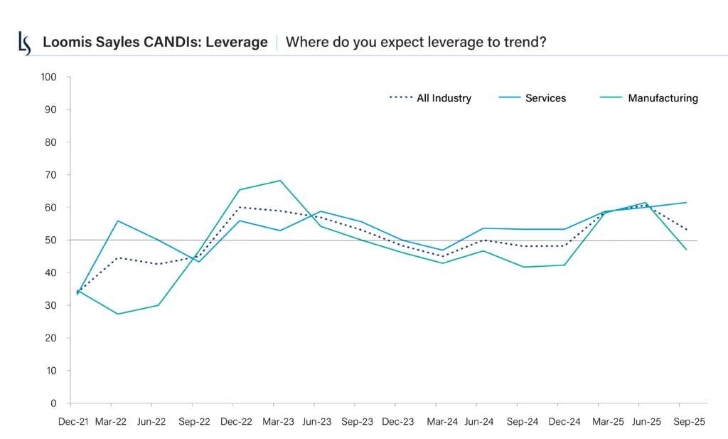 Chart source: Loomis Sayles Credit Analyst Diffusion Indices, as of 10 October 2025. For the leverage component, readings above 50 signal a rising level of fundamental deterioration. The chart presented above is shown for illustrative purposes only. Some or all of the information on this chart may be dated, and, therefore, should not be the basis to purchase or sell any securities. The information is not intended to represent any actual portfolio. Information obtained from outside sources is believed to be correct, but Loomis Sayles cannot guarantee its accuracy. This material cannot be copied, reproduced or redistributed without authorization.