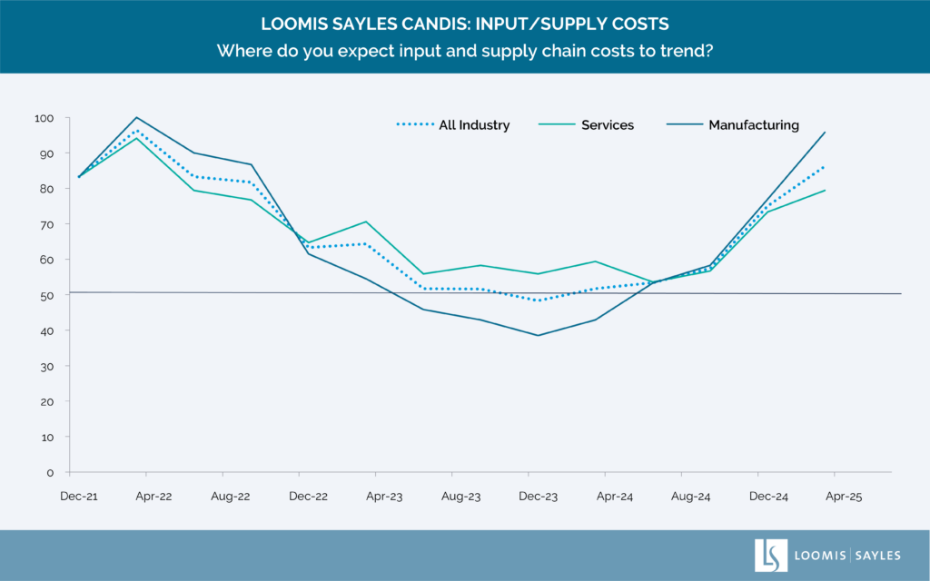 Chart source: Loomis Sayles Credit Analyst Diffusion Indices, as of 8 April 2025. For the input and supply chain costs component, readings above 50 indicate a rising trend. The chart presented above is shown for illustrative purposes only. Some or all of the information on this chart may be dated, and, therefore, should not be the basis to purchase or sell any securities. The information is not intended to represent any actual portfolio. Information obtained from outside sources is believed to be correct, but Loomis Sayles cannot guarantee its accuracy. This material cannot be copied, reproduced or redistributed without authorization.