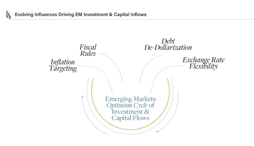 In the post-Covid years, we have seen many core EM economies implement positive structural reforms and adhere to disciplined monetary policy and fiscal rules. Interconnected factors—some consecutive, others simultaneous—have fostered an optimism that we believe could translate into a golden era for EM whereby credible policies support a more stable economic backdrop, attracting capital inflows and driving domestic investment, productivity and earnings gains, all of which support greater optimism.