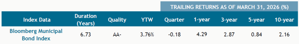 - New muni bond supply expectations remain strong, given increased project costs and less supportive Fiscal Policy. New issuance of muni bonds in Q1 tracked approximately 9-10% ahead of Q1 2025. We expect strong new issuance to continue in 2026, albeit potentially at a slightly lower pace than 2025ās record pace. New issuance continues to be fueled by inflationary effects (which increase municipal project costs) and decreased federal support for state and local entities, which could induce new borrowing needs and spur incremental new issuance. However, a continued rise of interest rates (i.e., borrowing costs) could start to taper supply.