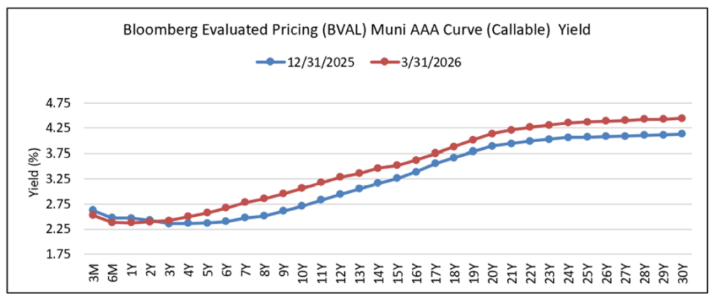 - At the end of the first quarter, the muni curve maintained a generally normal, upward-sloping shape, aside from a bit of a āhookā inside of six months where yields were elevated in correlation with the Fed funds rate. After flattening a bit in Q4 2025, the increase in muni yields beyond the 5-year mark was relatively uniform in Q1 (+20 to +30 basis points across most tenors), representing a more āparallelā upward shift this quarter.