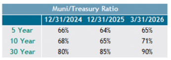 - Muni valuations, as measured by the muni-to-treasury ratio, cheapened (rose) in the first quarter after grinding richer (falling) during the second half of 2025. Across most tenors, the yield increases in Q1 were generally higher for munis than treasurys, thus the cheapening effect. This is at least partly attributable to seasonal reinvestment flows from muni coupons and maturities tapering off during Q1 while new muni supply continued its robust pace. As a result, the 5-year and 10-year muni-to-treasury ratios cheapened somewhat but still appear fairly rich by historical standards. The 30-year ratio is closer to fair value, in our opinion.