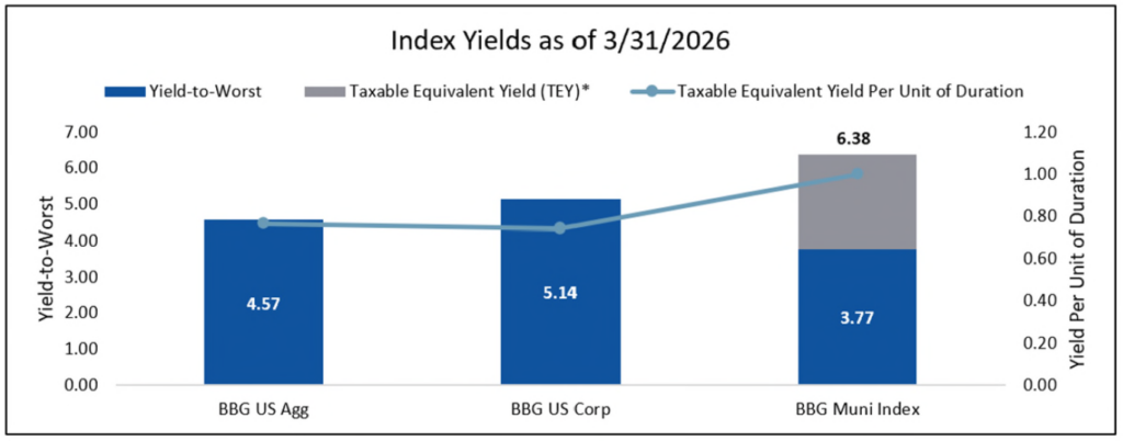 *The taxable equivalent yield is calculated using an effective tax rate of 40.8% which includes the 37.0% top federal marginal income tax rate and the 3.8% Net Investment Income Tax to fund Medicare. Source: Loomis Sayles and Bloomberg as of 3/31/2026. Indices are unmanaged and do not incur fees. It is not possible to invest directly in an index.
