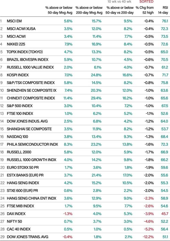 Global equities are in an uptrend across the board with the bulk of indices above respective 200-day and 50-day moving averages.