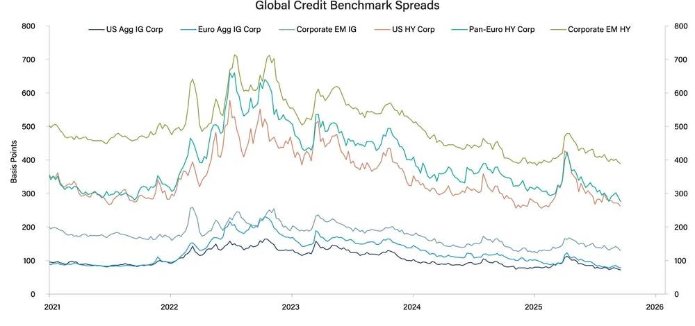 - Credit risk premiums are slim. While corporate credits continue to offer carry relative to Treasurys, excess return from spread compression looks harder to capture.