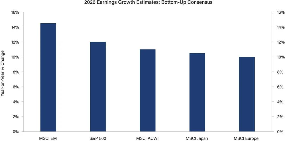 There is potential for a significant rebound in global corporate profitability in 2026. US markets, like those measured by the S&P 500 Index, have shown fundamental leadership based on profitability in 2025. Bottom-up consensus earnings estimates for emerging markets, Europe and Japan imply year-on-year growth rates of 10% or higher for 2026. Given our pro-cyclical stance, it is encouraging to see global indices firmly in growth mode.