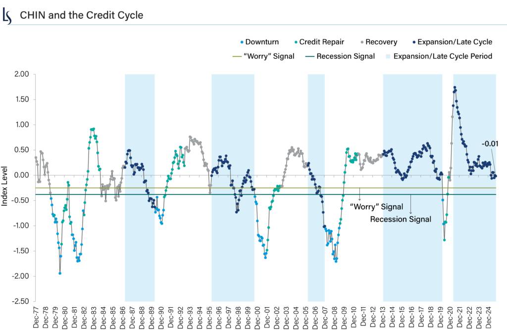Looking ahead, we will be watching a few things closely: the bottom-up fundamentals (particularly corporate earnings and profits), which are still holding up well, and any shifts in macro fundamentals or the credit outlook, which can move quickly based on news or changing sentiment. If corporate profits stay strong, we think the CHIN can hold steady around current levels. If profits start to slipāthanks to things like tariffs, policy changes, or other shocksāthen we would expect the CHIN to move lower and recession risks to rise. Historically, when the CHIN drops below -0.3 or -0.4, recession risk jumps dramatically. For now, though, the CHIN isnāt giving us any reason to think the expansion/late cycle phase is ending anytime soon.