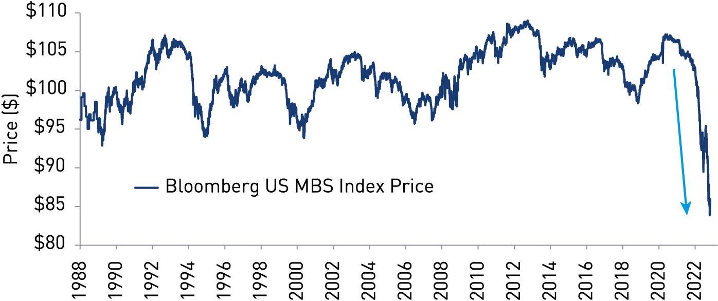 The Fed proceeded to hike its policy interest rate by an aggressive 425 basis points (bps) during 2022 in an effort to drive down inflation. Predictably, the bond market took a historic beating. A decadeās worth of real (inflation-adjusted) returns was wiped off the Bloomberg US Aggregate Bond Index. Agency mortgage-backed securities (MBS),ii one of the most interest-rate-sensitive fixed income sectors, saw total returns decline by an astounding 12% during 2022.iii