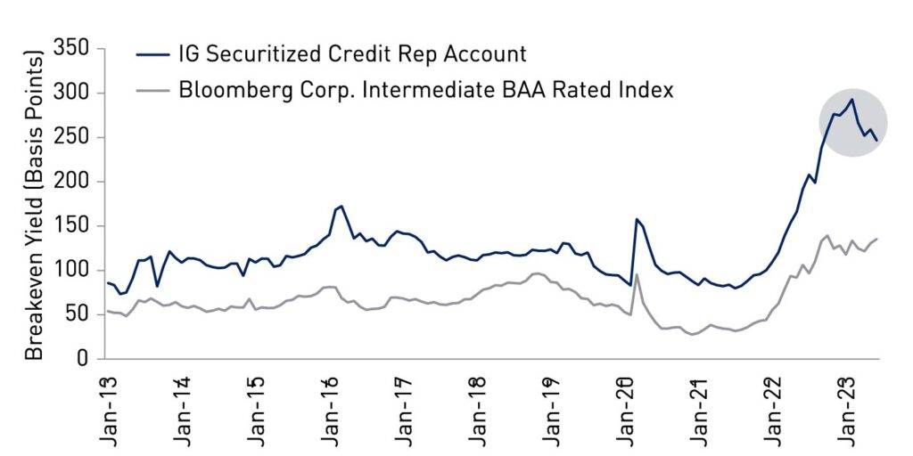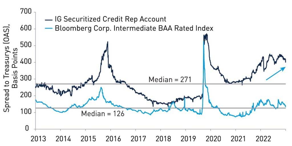 Source: Loomis Sayles. 10-Year history of spread to US Treasurys in basis points, IG securitized credit and IG corporate BBB rated bonds. Data as of 30 June 2023.