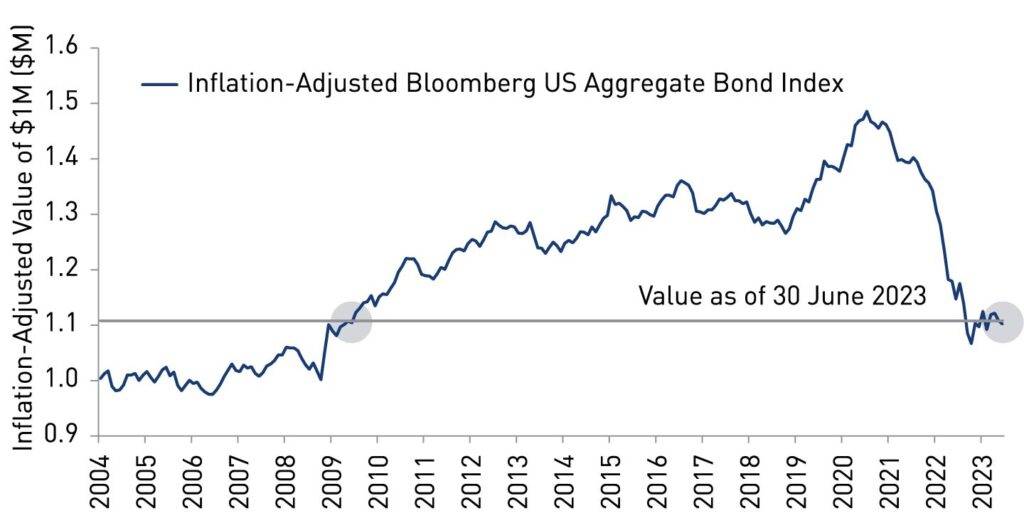 Source: Bloomberg, Inflation-Adjusted US Aggregate Bond Index (LBUSTRUU Index / CPI INDX Index). Data as of 30 June 2023.