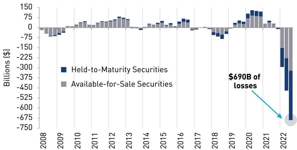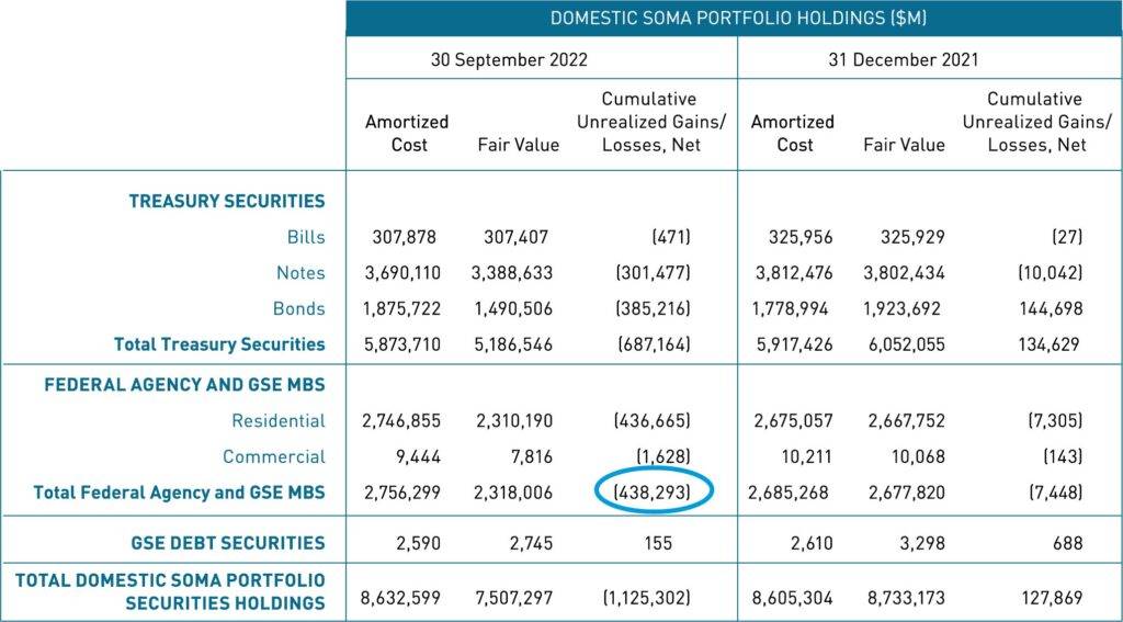 The Fedās unrealized losses in agency MBS exceeded $438 billion as of September 2022, while US banks were carrying another $690 billion in unrealized agency MBS losses.