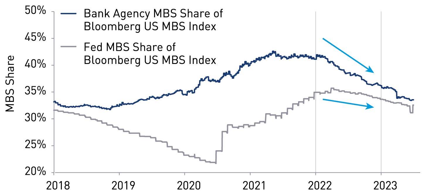 Source: Bloomberg. Share of US MBS Index, 2018-2023, .FEDMBSTOT Comdy / LUMSTRUU Index and ALBNTANB Index / LUMSTRUU Index. Data as of 30 June 2023.