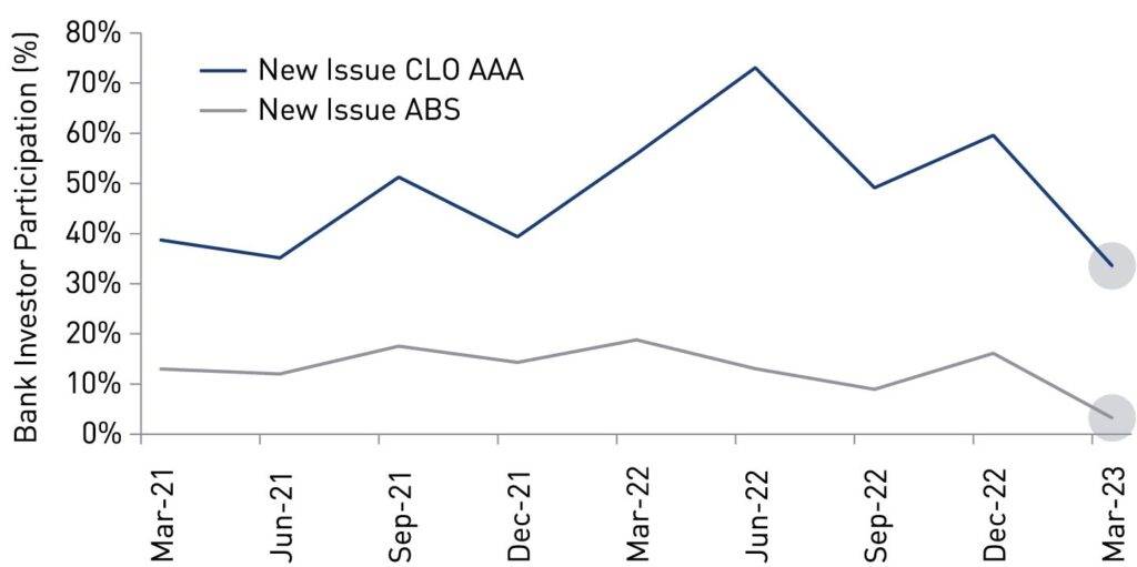 Source: J.P. Morgan Securities. Bank investor participation in new-issue AAA CLOs and ABS, by percentage. Data as of 31 March 2023.