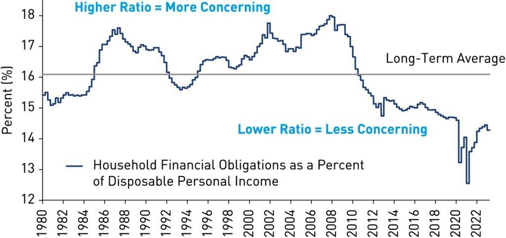Source: Board of Governors of the Federal Reserve System (US), Household Financial Obligations as a Percent of Disposable Personal Income [FODSP], retrieved from FRED, Federal Reserve Bank of St. Louis; https://fred.stlouisfed.org/series/FODSP. Data as of 30 June 2023.