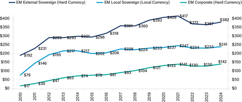 NEXGEM represents the J.P. Morgan Frontier EM bond index (inception: 31 December 2001). The NEXGEM index is a single-B average rating subset of the flagship J.P. Morgan Emerging Markets Bond Index (EMBI) series, with member countries maintaining inclusion in both the EMBI and the NEXGEM indices. Most importantly for investors, market infrastructure and liquidity are on an improving trajectory: from December 2015 to December 2024, the EM external sovereign market cap doubled to $1.4 trillion (now in line with US High Yield market cap). The largest EM fixed income benchmark by dedicated assets under management is the EMBI Global Diversified. This index, includes approximately 70 countries of which roughly 40 are frontier (NEXGEM countries, $325 billion market cap).1