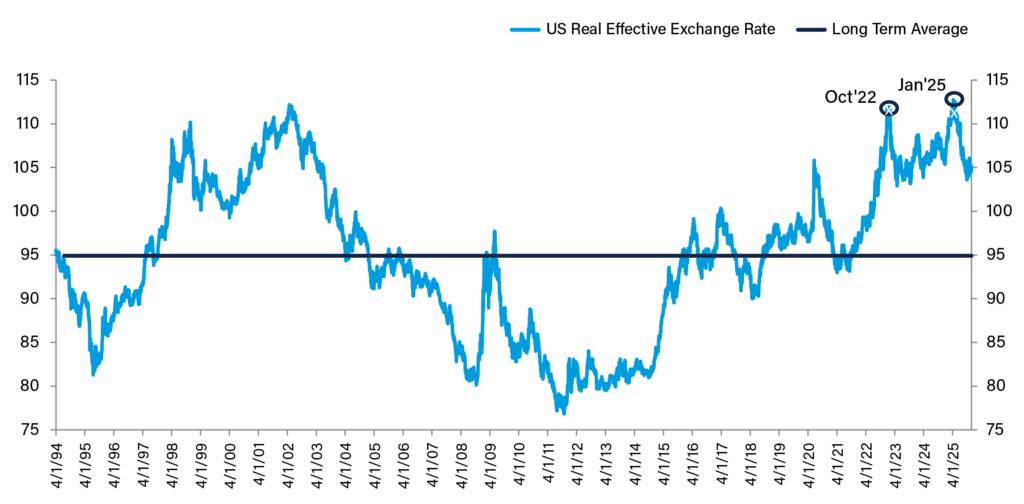 The US Dollar remains overvalued relative to its long-term average, suggesting to us that the USD may have further downside.