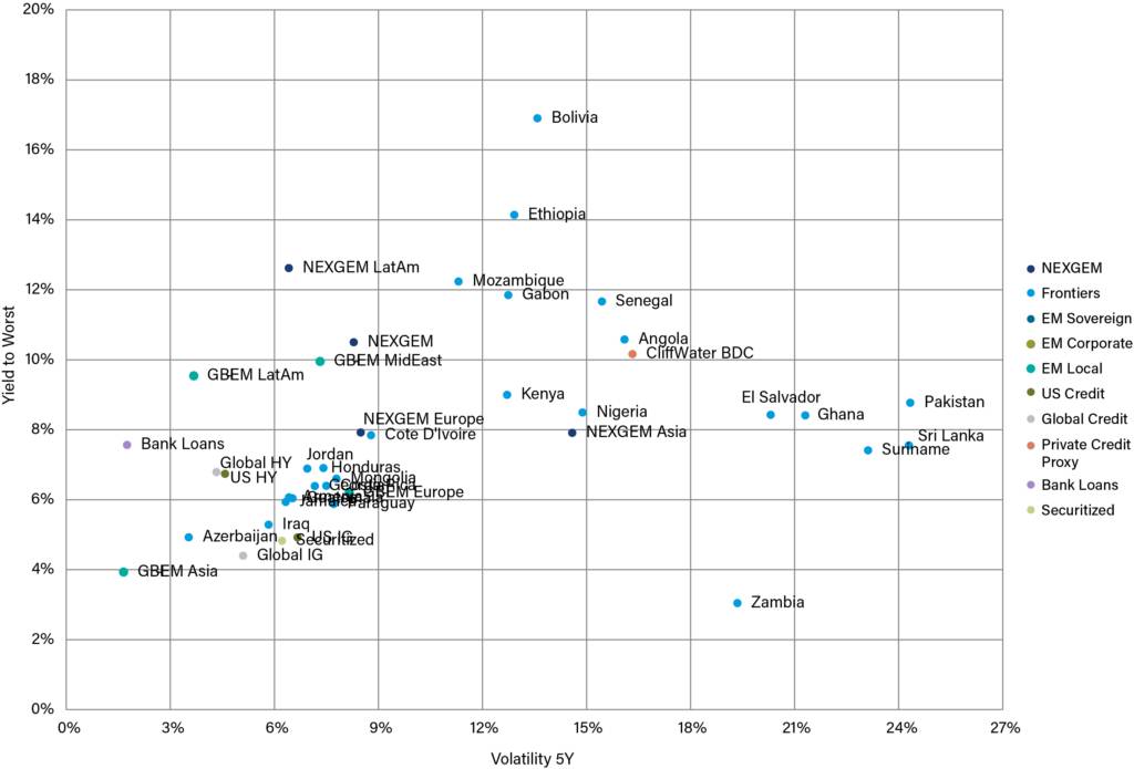 Frontier EM bonds typically offer significantly higher yields relative to their risk profile and duration compared to DM credit, including private credit.