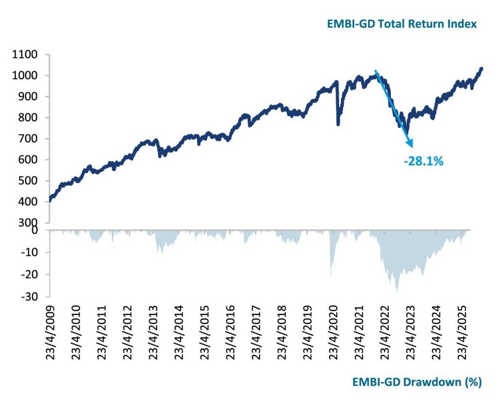 The chart below shows the EM sovereign credit total return index (J.P. Morgan EMBI Global Diversified Composite Index) that has fully reversed its post restructuring 2022 drawdown (-28%) as the broad EM universe transitions to credit repair.