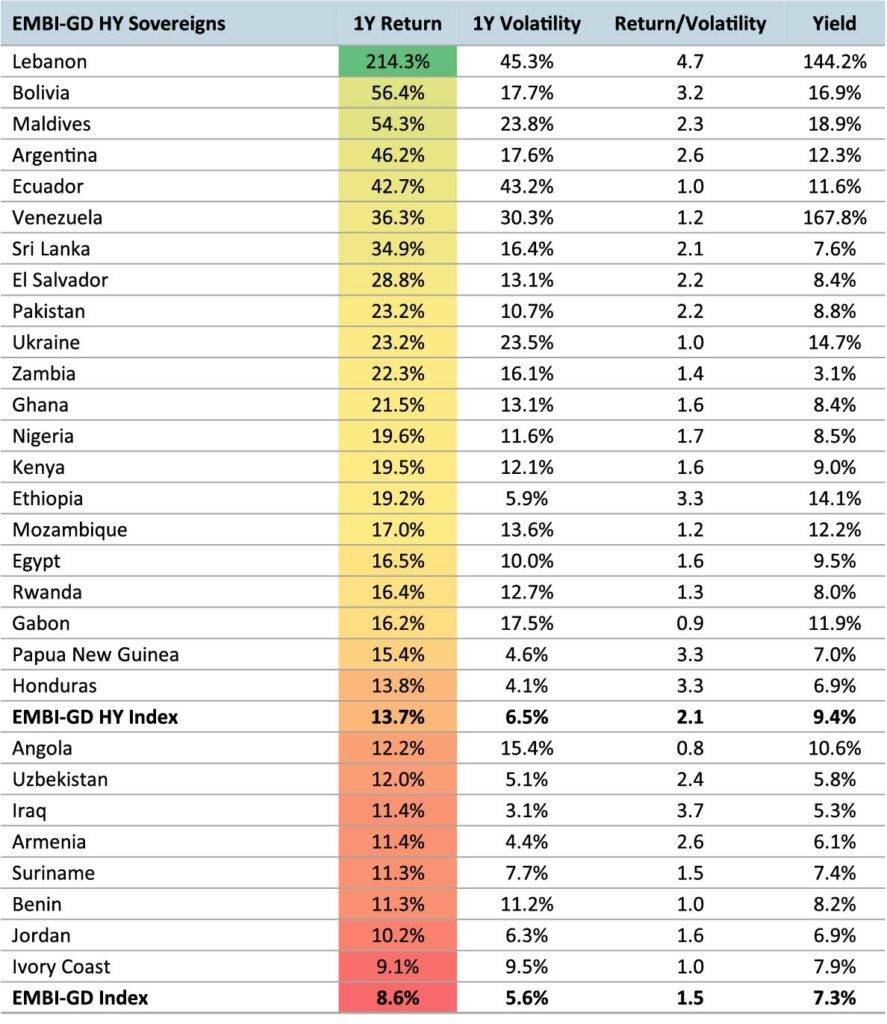 From the October 2022 USD cycle high, securities rated CCC & B among EM frontier sovereigns have led the global fixed income complex higher. This performance is in stark contrast to prior rate hiking cycles, largely attributed to the EM frontier sovereign transition from downturn to credit repair.