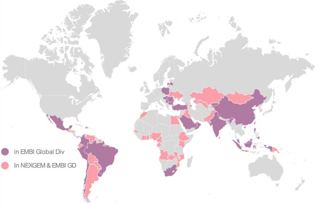 The map below shows all the countries that are part of the J.P. Morgan EMBI Global Diversified Index in purple and pink. Of these countries, those in pink are also part of the NEXGEM frontier index. It is clear that the EMBI Global Diversified Index contains many frontier names.