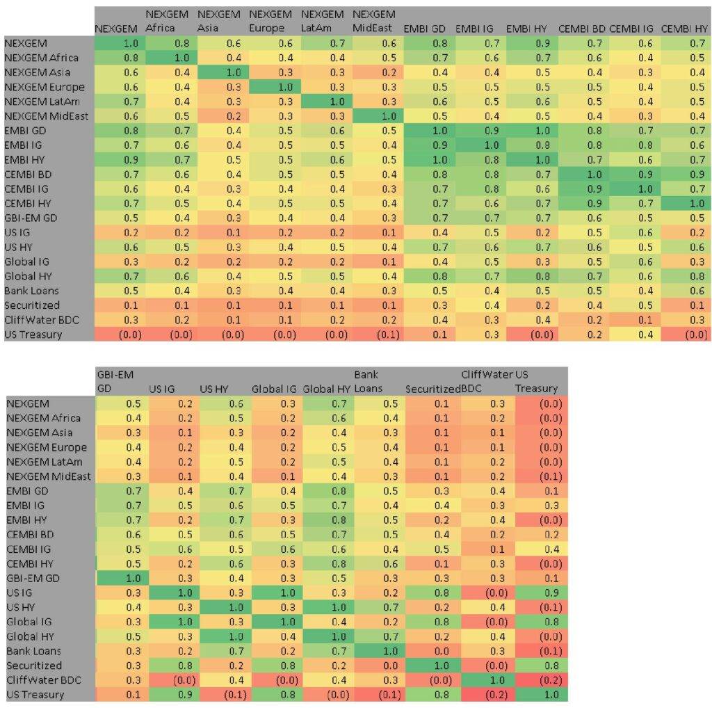 These asset classes include frontier (NEXGEM), EMD more broadly (EMBI, CEMBI and GBI-EM) developed markets (US and global HY, bank loans, securitized), private markets (proxied via the Cliffwater BDC index) and US Treasurys. The matrix results are expressed as a heat map, whereby the more āgreenā the number, the stronger the positive correlation between the two indices in question. For example, US HY has a high (0.7) correlation with Bank Loans whereas NEXGEM has a lower (0.5) correlation with Bank Loans.