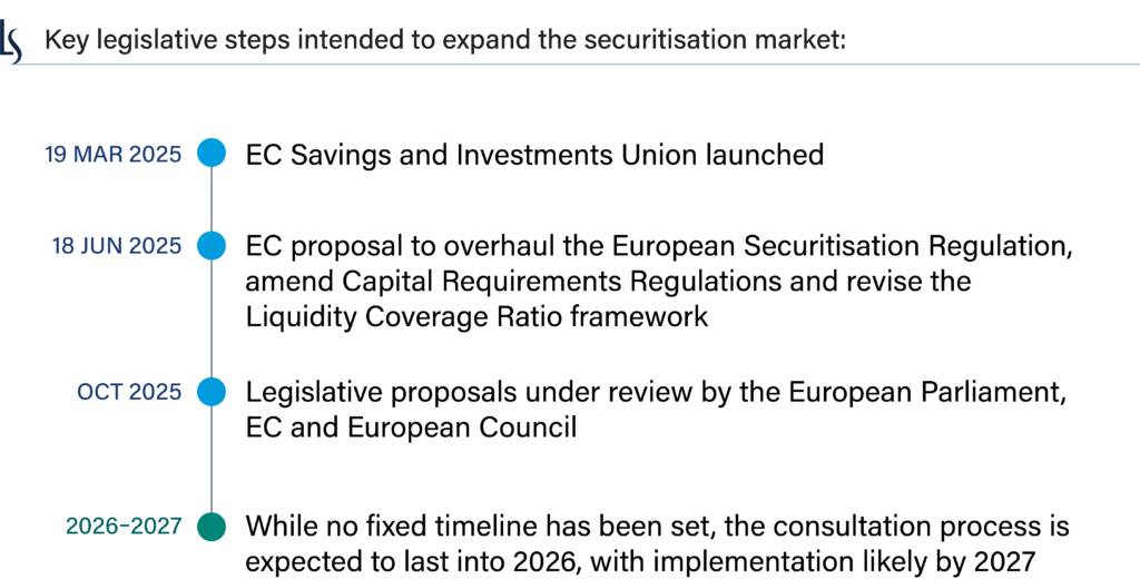 As part of this focus, the EC has introduced legislation to revitalise the European securitisation market. Steps to support its strategy include lower capital charges for banks under Capital Requirements Regulation and insurers under Solvency II, streamlined due diligence, and expanded eligibility for securitisations as liquid assets.